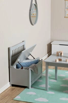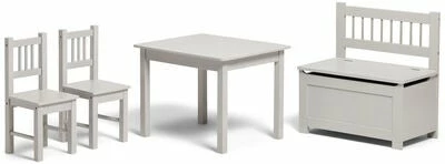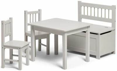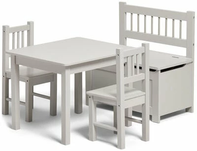 Innred barnerommet eller kjøkkenet, med dette fine møbelsettet fra Alice & Fox! Settet består av et bord, to stoler og en oppbevaringsbenk i stilren design. Møblene er laget av stabil MDF, og gir barnet en herlig plass for både måltider og hobbyaktiviteter. Løft på benkelokket, for å finne en romslig oppbevaringsplass til leker, hobbytilbehør og andre ting.