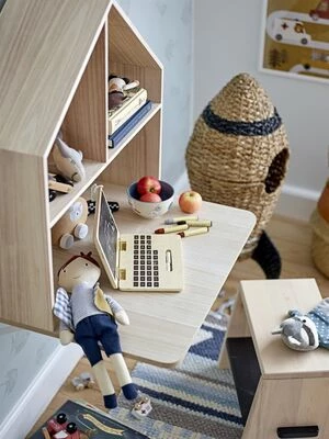 Hylle formet som et hus i stilrent og bærekraftig paulownia-tre fra Bloomingvilles kolleksjon Mini. Denne praktiske hyllen kan til og med brukes som et skrivebord. Perfekt både til oppbevaring av bøker og leker, og en plass der man kan tegne og pusle på! Hyllen har en tidløs nordisk design som passer inn i de fleste hjem.