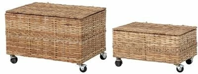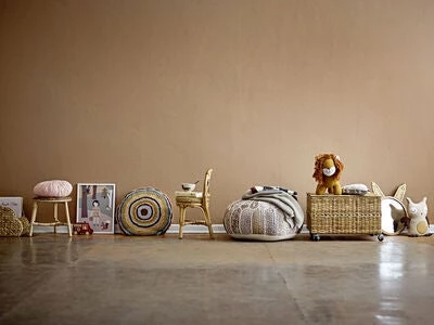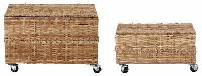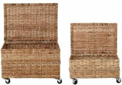 To rullbare oppbevaringskurver fra Bloomingville MINI. Kurvene er laget av bankuangress og rotting, og har unike metallhjul som gjør dem enkel å flytte rundt i hjemmet. Perfekt å bruke som lekekasser!
