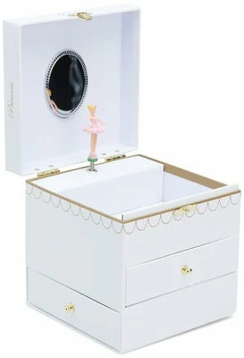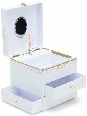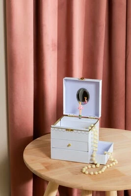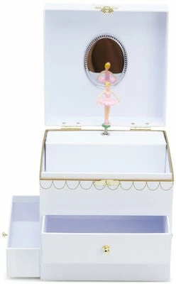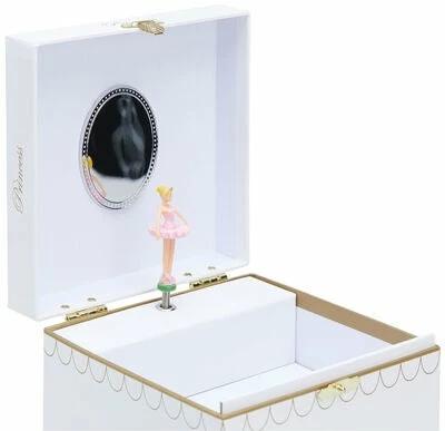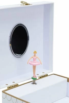 En vakker musikkboks fra Cloudberry Castle. Musikkboksen har en ballerina som danser til en fin melodi hver gang du åpner lokket. Den har et fint, ovalt speil på innsiden, og plass til smykker og andre ting du vil oppbevare på et fint sted. En søt og praktisk innredningsdetalj til barnerommet!