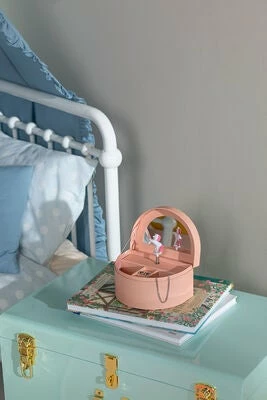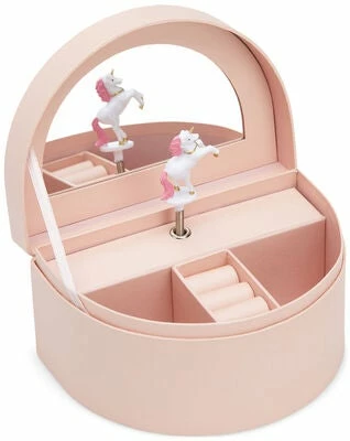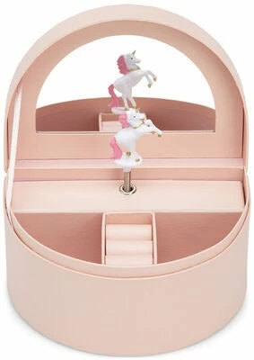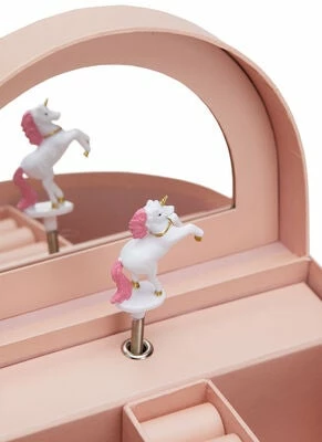 En vakker musikkboks fra Cloudberry Castle. Musikkboksen har en enhjørning som danser til en fin melodi hver gang du åpner lokket. Den har et fint, ovalt speil på innsiden, og plass til smykker og andre ting du vil oppbevare på et fint sted. En søt og praktisk innredningsdetalj til barnerommet!