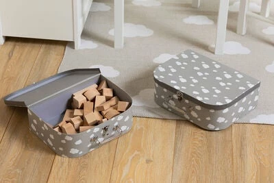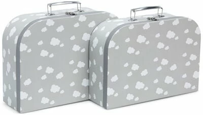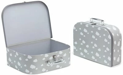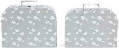 En 2-pack med pappkofferter i flott design fra Cloudberry Castle. Med et håndtak i sølv og en liten låsespenne, passer koffertene både som oppbevaringsboks, leketøy, og også som reisekoffert når barnet er på sprang. Mål stor koffert: L 32.8 x B 24.2 x H 11 cmMål liten koffert: L 31.4 x B 22.5 x H 10 cm