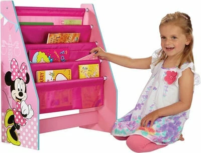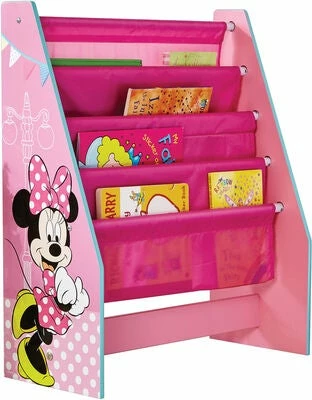 En fin bokhylle med motiv av Minni Mus. Den praktiske bokhyllen har fire rom som med plass til bøker i alle størrelser. Bokhyllens størrelse gjør det enkelt for barnet ditt å plukke ut og legge tilbake bøkene selv. Et fargerikt innslag i barnerommet!