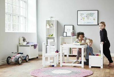 Smart, praktisk MATHILDE bord og stoler fra Hoppekids med smart lagringsrom. Stolene er så lette, at barna selv kan flytte dem rundt. Benken har en sikring, som gjør at lokket blir stående i den åpnede posisjonen. Dette betyr at hvis barnet åpner benken i en 45-graders vinkel, vil lokket bli i den vinkelen, noe som beskytter barnets fingre. Sikringsstyrken kan justeres ved hjelp av Z-nøkkelen som inngår. – Mål: Bord H 50 x B 59 x D 74 cm. – Mål: Benk H 56 x B 31 x D 67 cm. – Mål: Stol H 56 x B 31 x D 32 cm. – Settet er overflatebehandlet med vannbasert lakk uten skadelige kjemikalier, og er laget av FSC® (FSC-C109484)-sertifisert furu og MDF. – furutre, MDF.