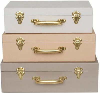 Kofferter fra JaBaDaBaDo i 3 forskjellige størrelser med håndtak i metall. De har to låser for å kunne bevare hemmeligheter. Perfekte til oppbevaring av leker og accessoirer. – 3-pack. – Anbefalt alder: fra 3 år. – Papp, metall.
