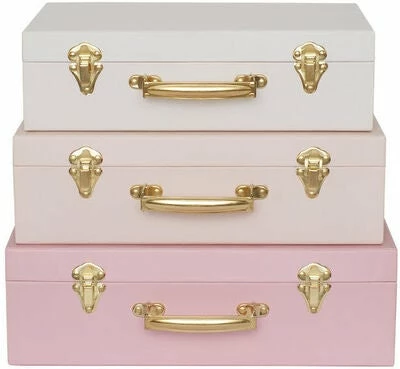 Kofferter fra JaBaDaBaDo i 3 forskjellige størrelser med håndtak i metall. De har to låser for å kunne bevare hemmeligheter. Perfekte til oppbevaring av leker og accessoirer. – 3-pack. – Anbefalt alder: fra 3 år. – Papp, metall.