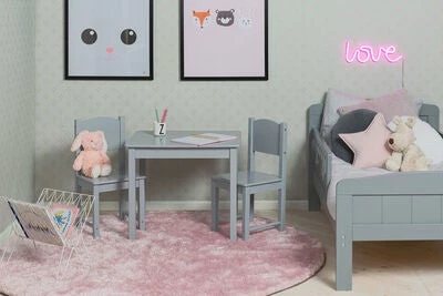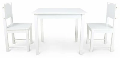 Et komplett sett med riktig fine møbler i tre til barnerommet. Dette møbelsettet fra JLY inneholder et bord og to stoler. Møbelgruppen passer perfekt til alt fra tegning til teselskap. Setter laget i tre, og stolene er både sterke og solide. Inneholder:1 stk bord, 2 stk stoler.Mål: Bord: H 51 x B 50 x L 60 cm.Stoler: H 60 x B 30 x D 30 cm.Sittehøyde: H 30 cm.Materiale: tre.Farge: hvit.
