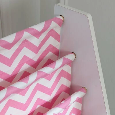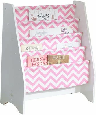 En fin bokhylle fra KidKraft. Denne praktiske bokhyllen har en robust MDF-ramme og fire lommehyller i stripete canvasstoff, med plass til bøker i alle størrelser. Bokhyllens størrelse gjør det enkelt for barnet å plukke ut og sette inn bøker selv. Passer til alle barnerom!
