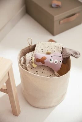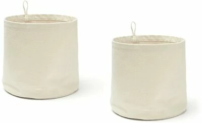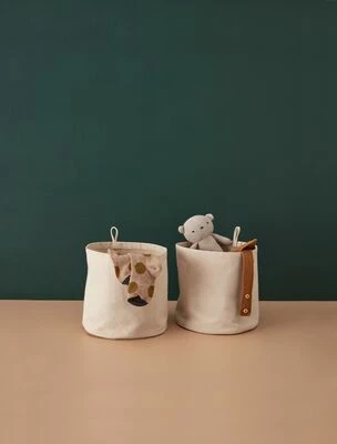Sylindrisk oppbevaringskurv fra Kids Concept i økologisk bomull. Takket være sin stabile konstruksjon kan den stå opprett selv. Den kan også henges på veggen ved hjelp av hanken. – 2-pakning. – GOTS-sertifisert økologisk bomull.