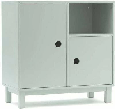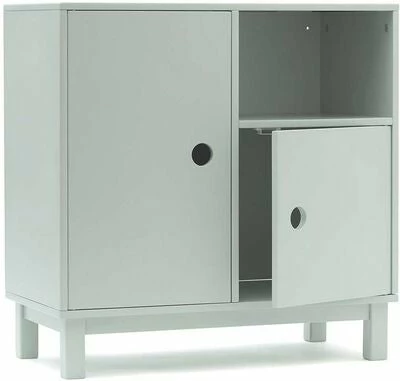 Fint Star skap fra Kids Concept. Dette mindre oppbevaringsskapet gjør det mye enklere å rengjøre og finne de riktige lekene i lekerommet. Det er laget av MDF og har tre seksjoner – to med dør og en åpen. Bak den store døren på venstre side er det to hyller som fritt kan justeres i høyden for å passe til leker og spill. Skapet har en brakett på baksiden som gjør at det kan monteres i veggen for å hindre at det tipper. Skruer til vegg er ikke inkludert. – Skap: MDF– Bein: gummitre