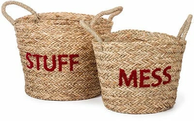 To stilige oppbevaringskurver fra KidsDepot. Kurvene er laget av flettet sjøgress, og prydes av en kul tekst!