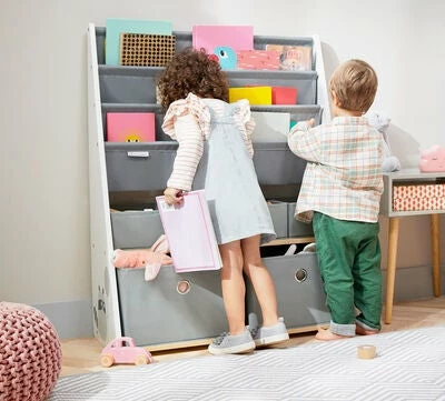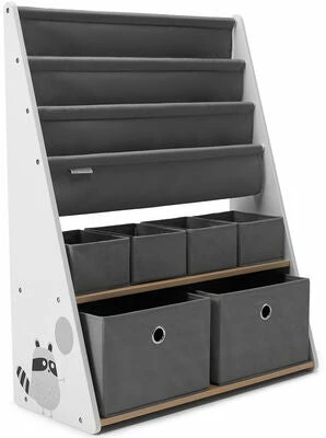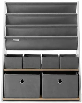 En fin bokhylle fra Kinderkraft, med en robust konstruksjon som også kan festes til veggen. Hyllen har fire stoffhyller og to nedre hylleplan. Den inneholder seks leketøybeholdere, perfekt for oppbevaring av både bøker, spill og leker.- Hyllen skrues fast til veggen for å ytterligere øke barnets sikkerhet når det leker.- Seks leketøybeholdere er inkludert.