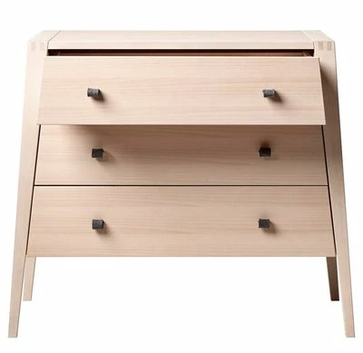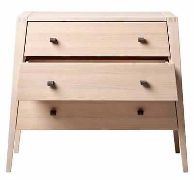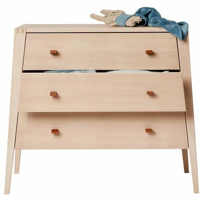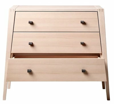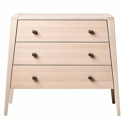 Linea er en stilren kommode i skandinavisk design med smakfulle detaljer, fra Leander. Kommoden har tre skuffer med myk bremsemekanisme, som sikrer at små barn ikke klemmer fingrene. Skuffene har myke hanker av filt, som gir et mykt og minimalistisk inntrykk. Håndtakene kan byttes ut mot andre farger, eller hanker av lær. Kommoden er behandlet med slitesterk lakk som holder i mange år. Linea-kommoden kan også gjøres om til en stellekommode ved å kombineres med stellebordene Linea eller Matty fra Leander (kjøpes separat). Spesifikasjoner: Høyde: 85 cm Bredde: 100 cm Dybde: 50 cm Vekt: 40 kg Materiale: Solid bøk, MDF, sponplate