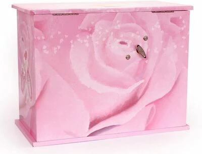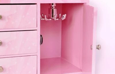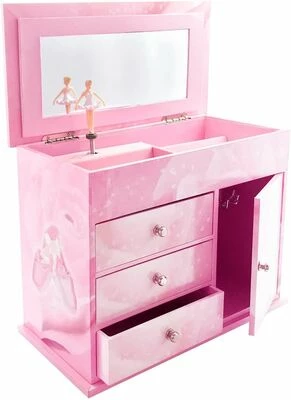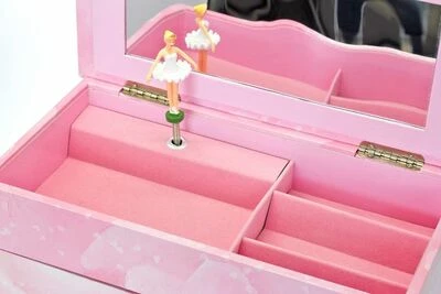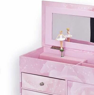 Et fint, stort smykkeskrin fra Trousselier. Skrinet er designet som en kommode, med flere skuffer og oppbevaringsmuligheter. Dessuten sitter det et speil i lokket, så du kan speile deg mens du prøver halskjeder, armbånd, øredobber og annet. Når spilledåsen vris opp på baksiden, danser ballerinaen, mens vakker musikk spilles av!