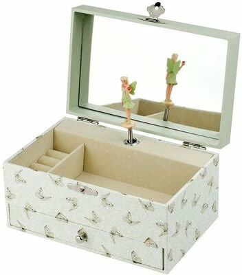Et nydelig smykkeskrin med spilledåse fra Trousselier. Smykkeskrinet har en fe inni, som danser til en fin melodi, hver gang du åpner lokket. Skrinet har et speil i lokket og flere rom til smykker og andre småting. Flotte blomstermotiv pryder utsiden av skrinet. En praktisk og vakker innredningsdetalj!