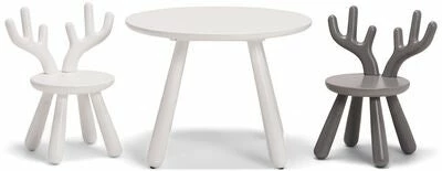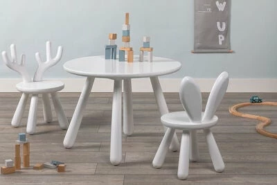 Et stilig, rundt bord fra Minitude, perfekt inne på barnerommet. Bordet er laget av tre, og passer fint med stolene med dyreører, fra Minitudes Nordic-serie.