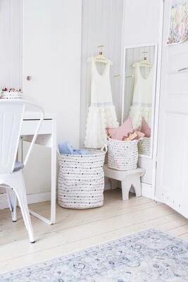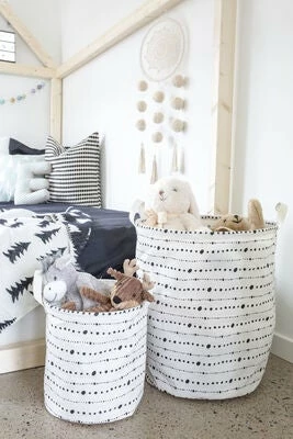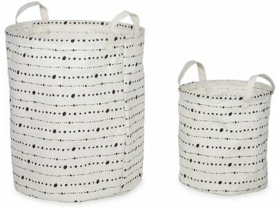 En pakke med to stk funksjonelle og lekre oppbevaringskurver i tøy. Kurvene er utstyrt med praktiske håndtak. Her kan du oppbevare både leker, klær og blader! En fin innredningsdetalj som spreker opp rommet!Mål: Stor: Ø 38 x H 45 cm.Liten: Ø 26 x H 28 cm.Farge: hvit, svart.