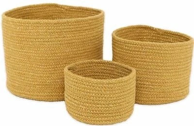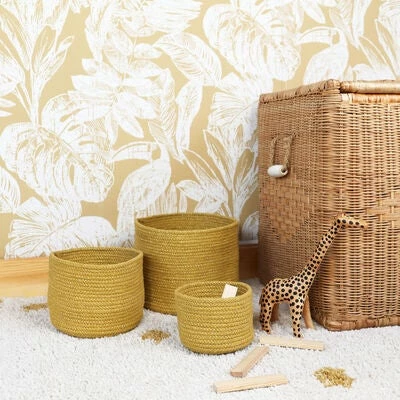 Et sett med 3 fine oppbevaringskurver i en herlig honningnyanse, fra Nattiot. Kurvene er håndflettede av bomull, og er både praktiske og dekorative. Den subtile fargen gjør at de passer fint i alle hjemmets rom. Perfekte til å ha leker eller skittentøy i. Giftfri tekstilproduksjon – bra for miljøet.