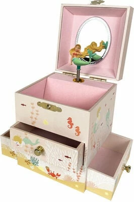 Rosa smykkeskrin fra Trousselier med fire rom til småting. Det har et lite speil og en dansende havfrue som du trekker opp på baksiden. Boksen har en lås for å kunne bevare hemmeligheter. – CE-merket. – Anbefalt alder: fra 3 til 12 år. – kartong, filt.