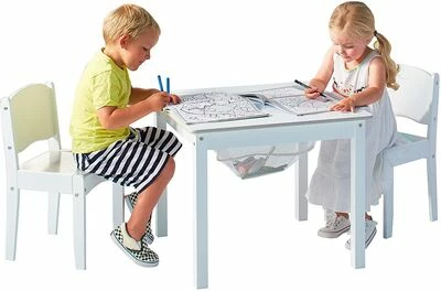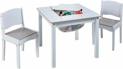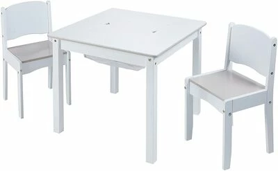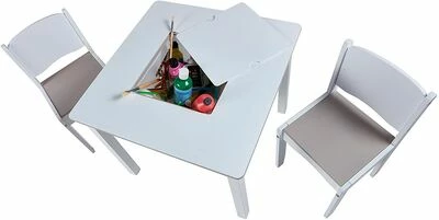 Et fint møbelsett fra Worlds Apart, bestående av et bord og to stoler. Under bordplaten skjuler det seg et oppbevaringsnett, som er praktisk å ha bøker, penner og annet i. Bordet og stolene er i lite format, og beregnet for mindre barn. Det er enkelt å tørke av etter lek.